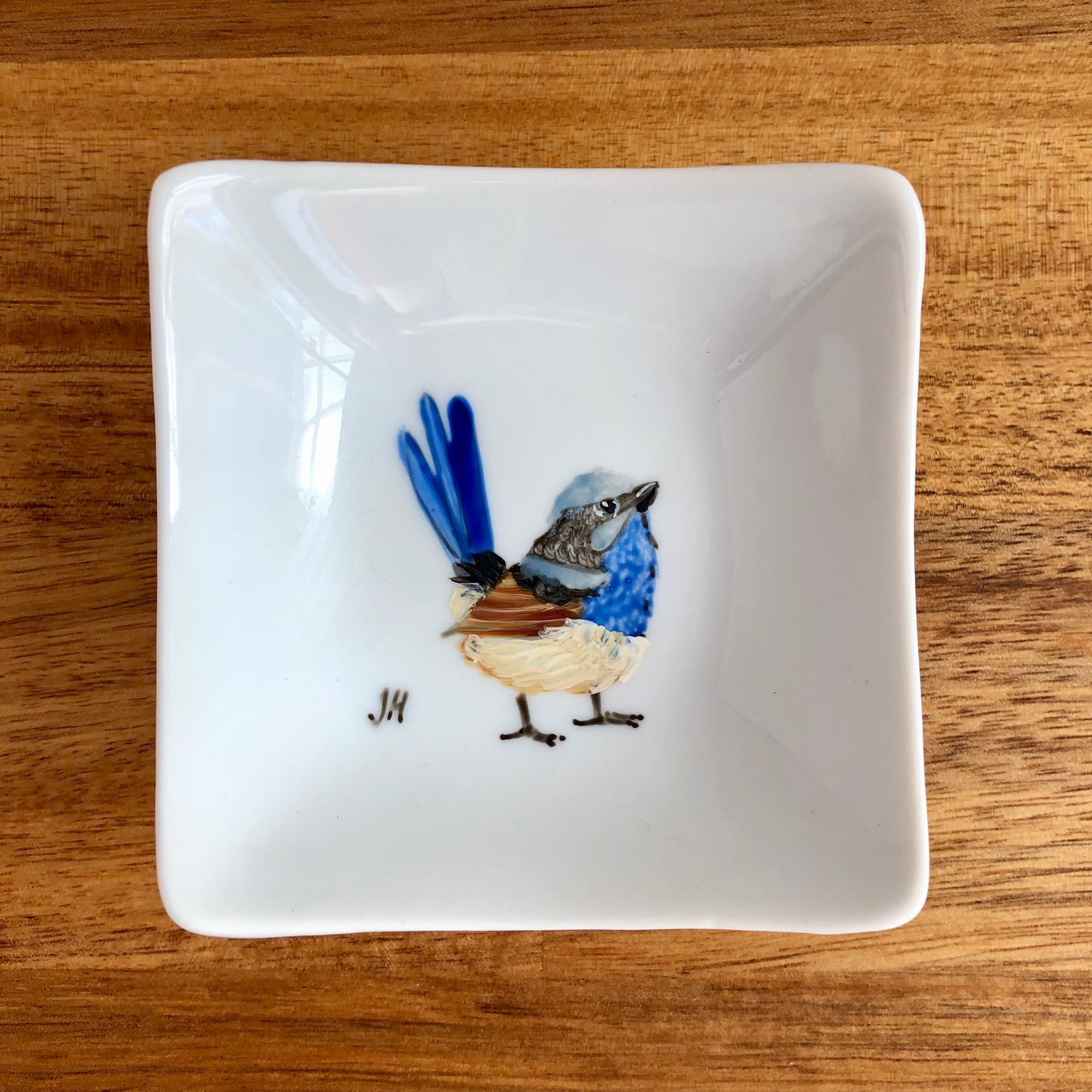 Male Superb Fairywren on an up-cycled square white ceramic trinket dish 🍃