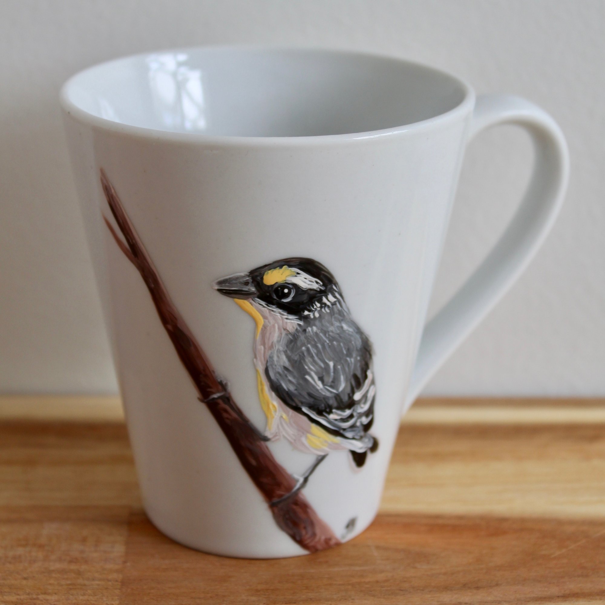 Hand painted Striated Pardalote on an upcycled white ceramic mug 🍃 By Tasmanian artist Jenae Hall One of a kind.