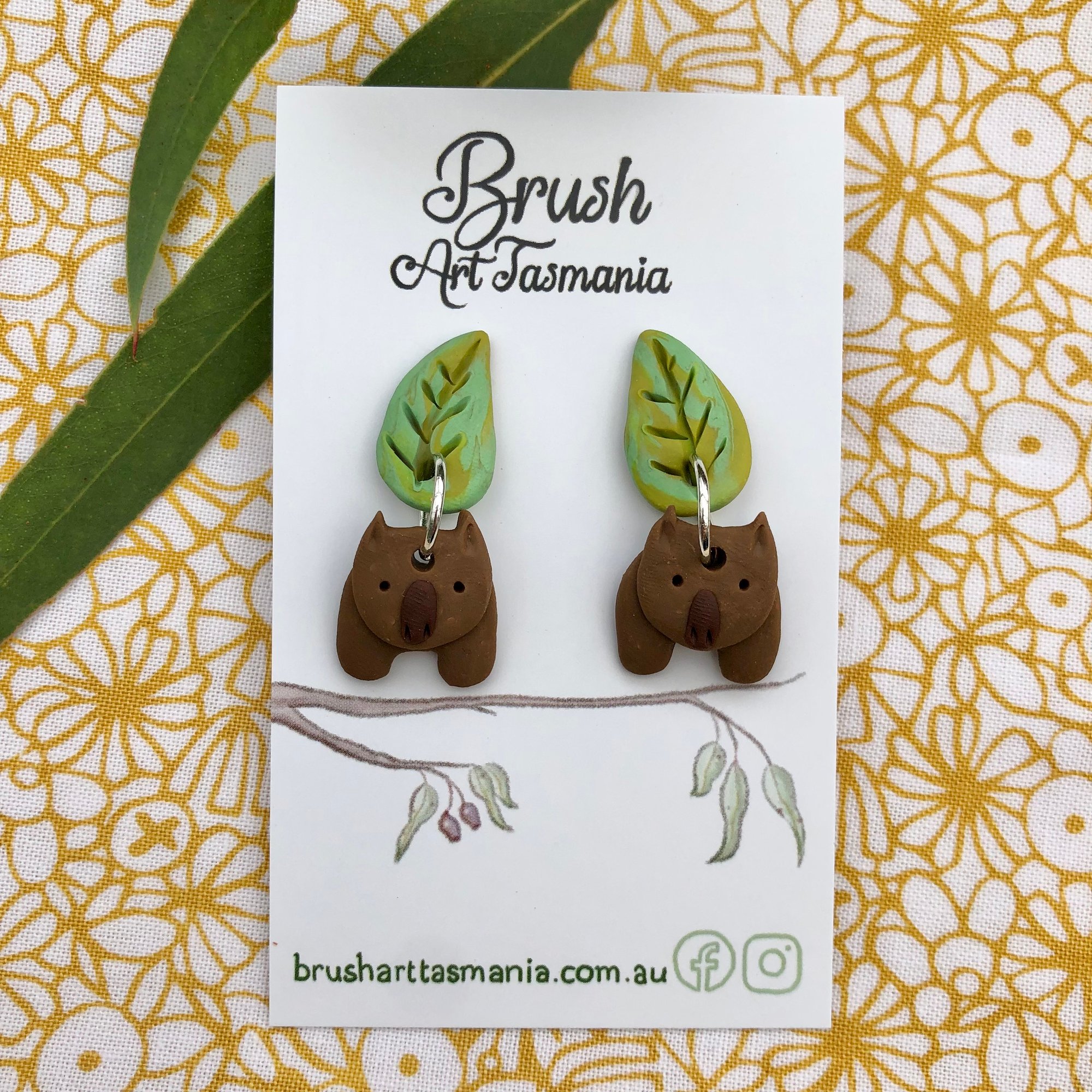Handcrafted Tassie Wombat hanging from a leaf polymer clay earrings 🍃